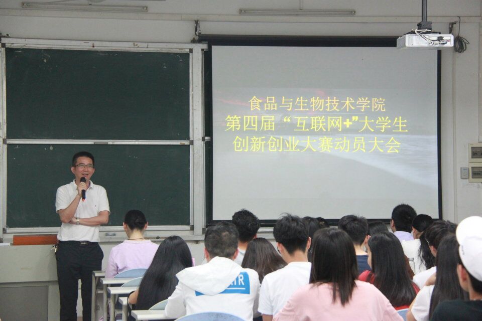 4月22日,食品与生物技术学院在南海校区教学楼1220隆重举行该院第四届“互联网+”大学生创新创业大赛动员大会。该院院长邓毛程教授、党总支书记揭广川老师以及学院各班级主要学生干部参加了本次活动。本次活动由王秀兰老师主持。